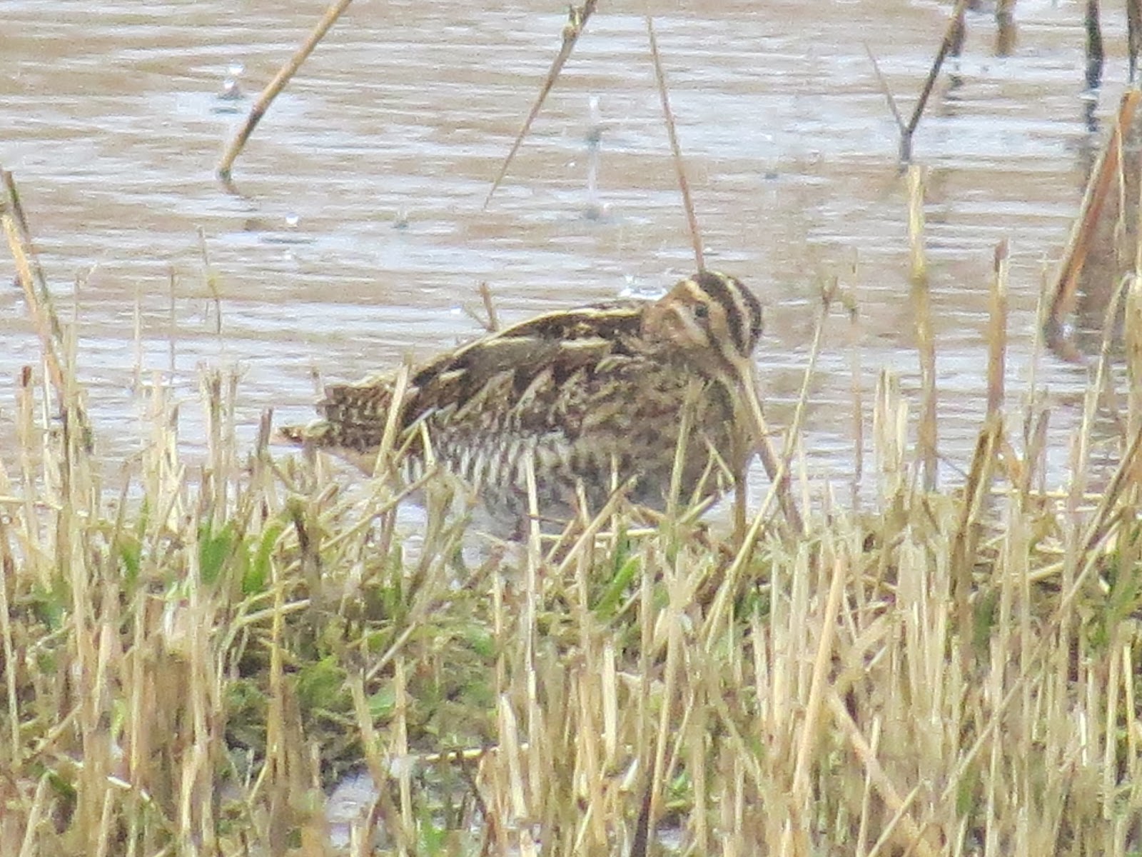 It was a nicer start to the day at Strumpshaw compared to last week. I walked through the woods, listening to a song thrush singing proudly in a tree. It's song switches from being joyful to mournful with each few phrases, but is still a delight to my ears when I listen to it. At Fen Hide, I watched four Chinese water deer feed or chase one another within the strimmed open areas between sections of reed beds at the back of the pool. A pair of common snipe betrayed their hiding spots with their sudden movements as they probe the mud between the stubbled reed stems. Then a short rain shower arrived, tipping it down for a few minutes. Once the shower stopped, it cued the appearance of a kingfisher which posed on one of the taller posts standing at either side of the pool as if to mark the end of the rain.
