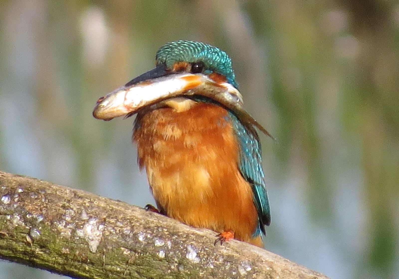 Next, I saw two kingfishers flash by with one of them staying after chasing the other away. It hovered in the air before plunging down into the water successfully catching a fish. It was a roach and seemed a bit big for the kingfisher to handle, but it still brought it to the perching branch right in front of me and started bashing it against the perch to kill this wiggling fish in it's bill. It left, but it seemed it wasn't convinced that it was really dead and came back for a second bashing session. I got plenty of great shots, but by the end of this ordeal, the fish was starting to lose scales and the kingfisher ended up leaving with it impaled and stuck to the side of it's bill and hanging over one eye. I also saw a heron, two mute swans and Cobber the black swan in hot pursuit. Then everything went quiet as someone else entered the hide, though I caused the Chinese water deer to run back to the front of the hide as I was leaving.
